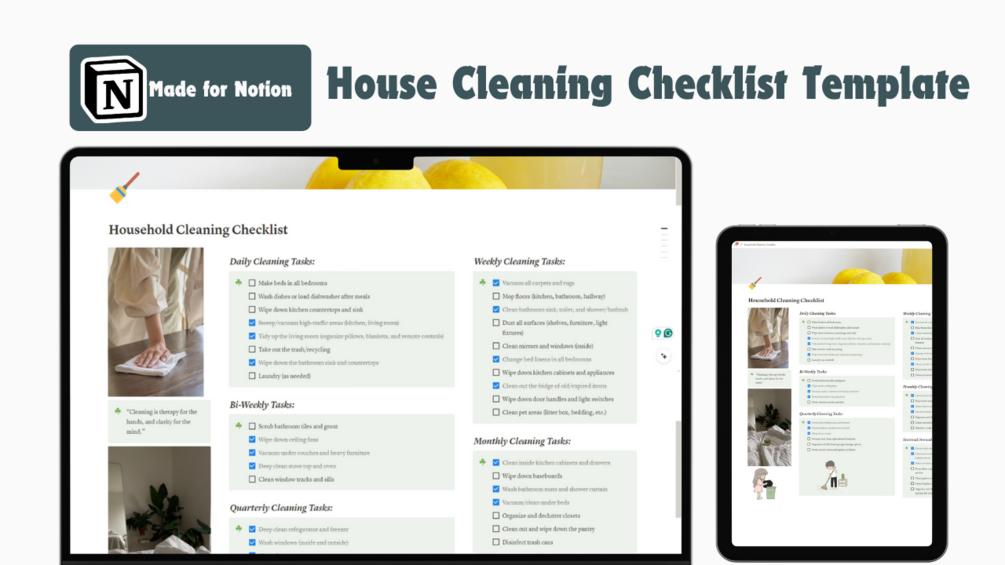 Say goodbye to cleaning chaos and hello to a clutter-free, organized home! Our Household Cleaning Checklist Notion template is designed to help you stay on top of your cleaning routine without the overwhelmed.